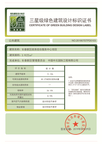 獲獎情況:獲吉林省住房和城鄉建設廳頒發的三星級綠色建筑設計標識證書